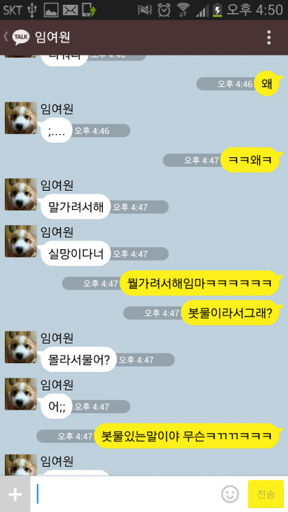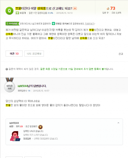 "**씨, 아까 봇물 터졌냐는 말 듣고 좀 어이 없었는데;;; 혹시 일베해요?"