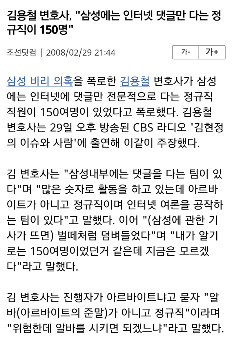 김용철 전 삼성 법무팀장이 폭로한 삼성 댓글정규직 150명